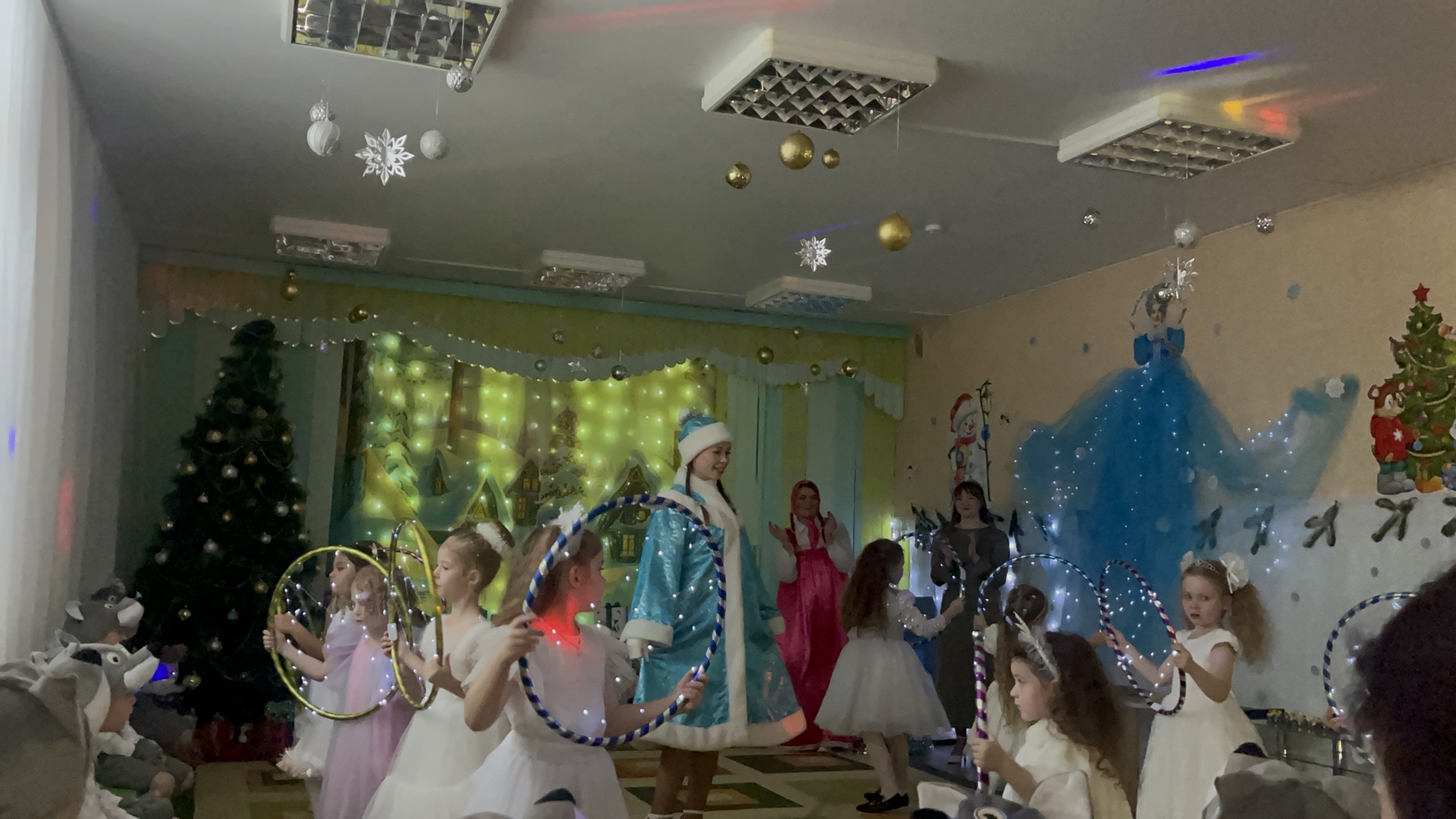 Разноцветные, сверкающие гирлянды и ярко украшенная ёлочка принесли детям ощущение чуда. С самого начала представления сказочные герои увлекали детей в волшебный мир сказки. Дети окунулись в праздничную атмосферу приключений, поучаствовали в интересных конкурсах. С появлением Деда Мороза начался настоящий праздник с песнями и танцами, хороводами.